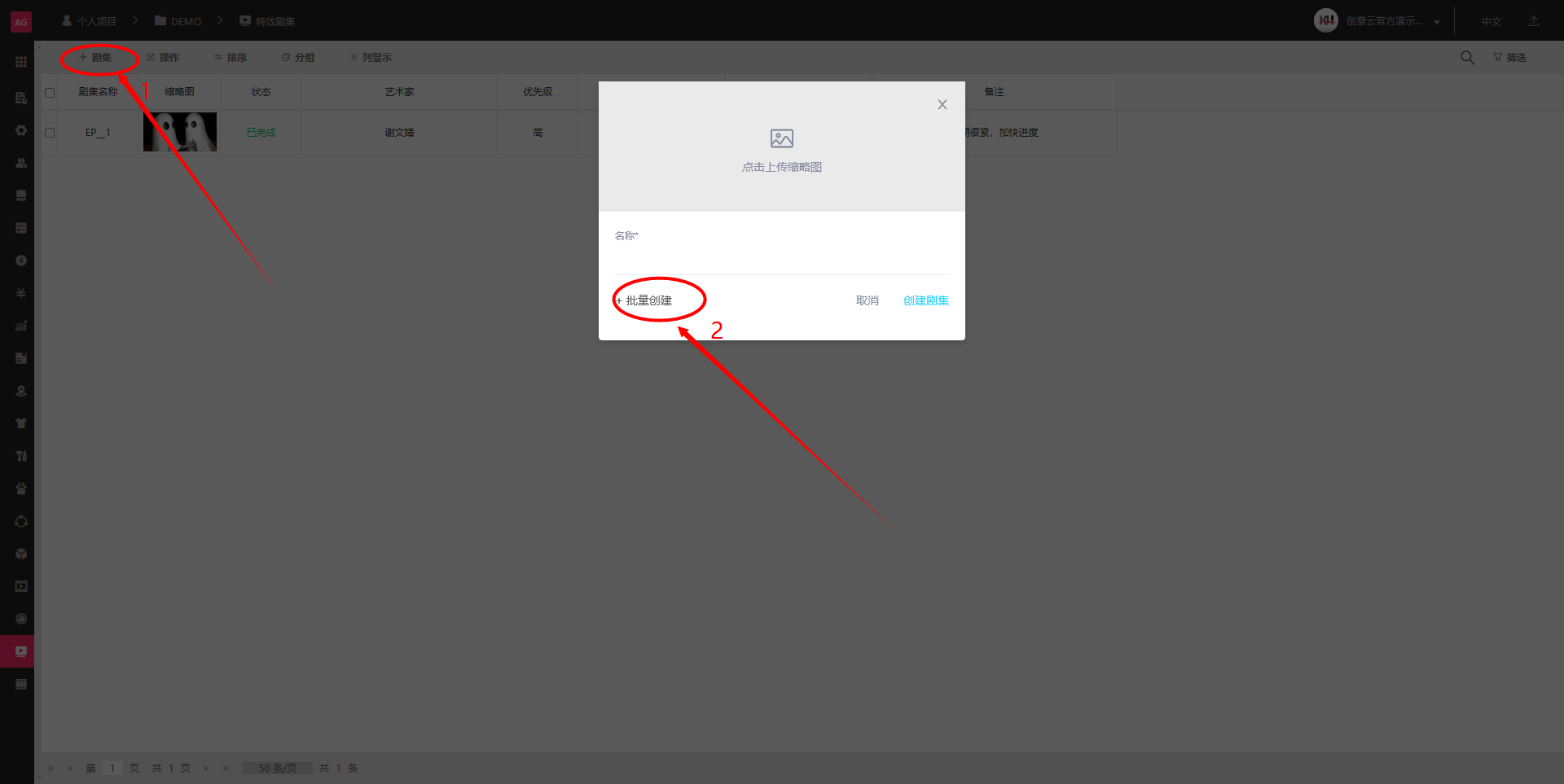 如果需要批量创建剧集任务,点击“+剧集”,在面板中再点击“+批量创建”即可开始批量创建。批量创建完毕后,依旧需要手动修改缩略图、状态、优先级并指派艺术家。