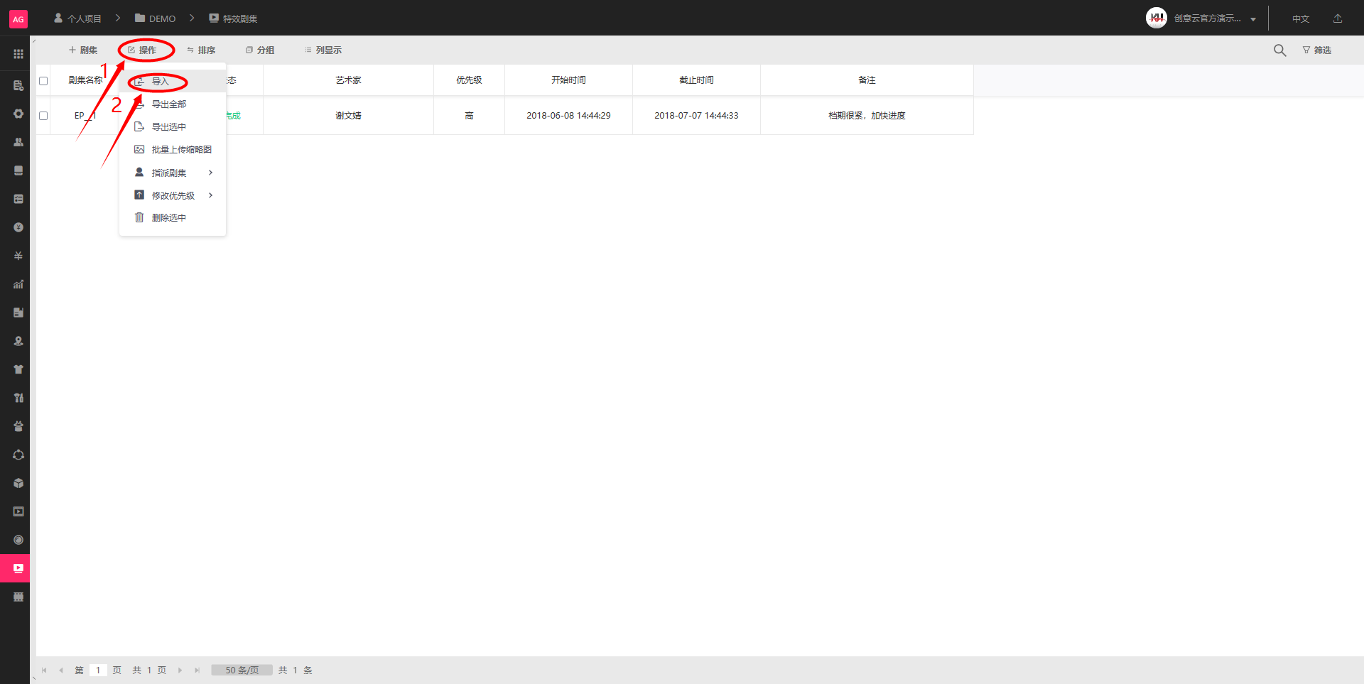 从AGILESHOT导航栏进入项目的“特效剧集”模块,点击“操作”-“导入”即可开始一键导入剧集任务数据。注意目前AGILESHOT仅支持csv格式的数据录入。