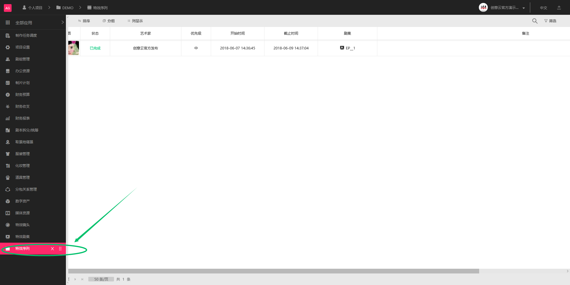 从AGILESHOT导航栏进入项目的“特效序列”模块,“特效序列”模块主要负责的是“剧集”模块中剧集细分的各个序列的制作和管理。在这里创建所有需要后期制作的剧集下的每个序列任务,并指派给相应的艺术家。
