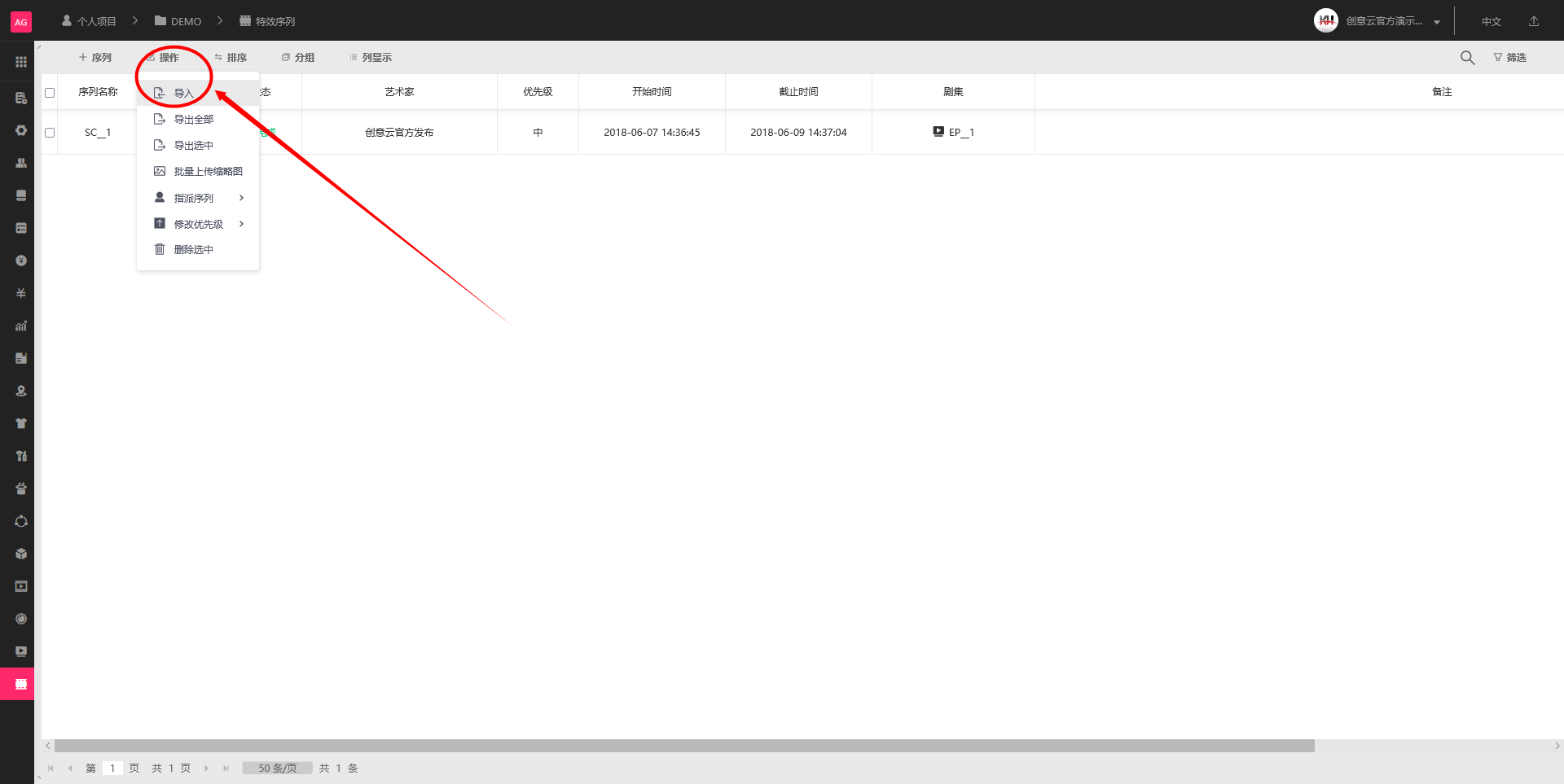 从AGILESHOT导航栏进入项目的“剧集”模块,点击“操作”-“导入”即可开始一键导入序列任务数据。注意目前AGILESHOT仅支持csv格式的数据录入。
