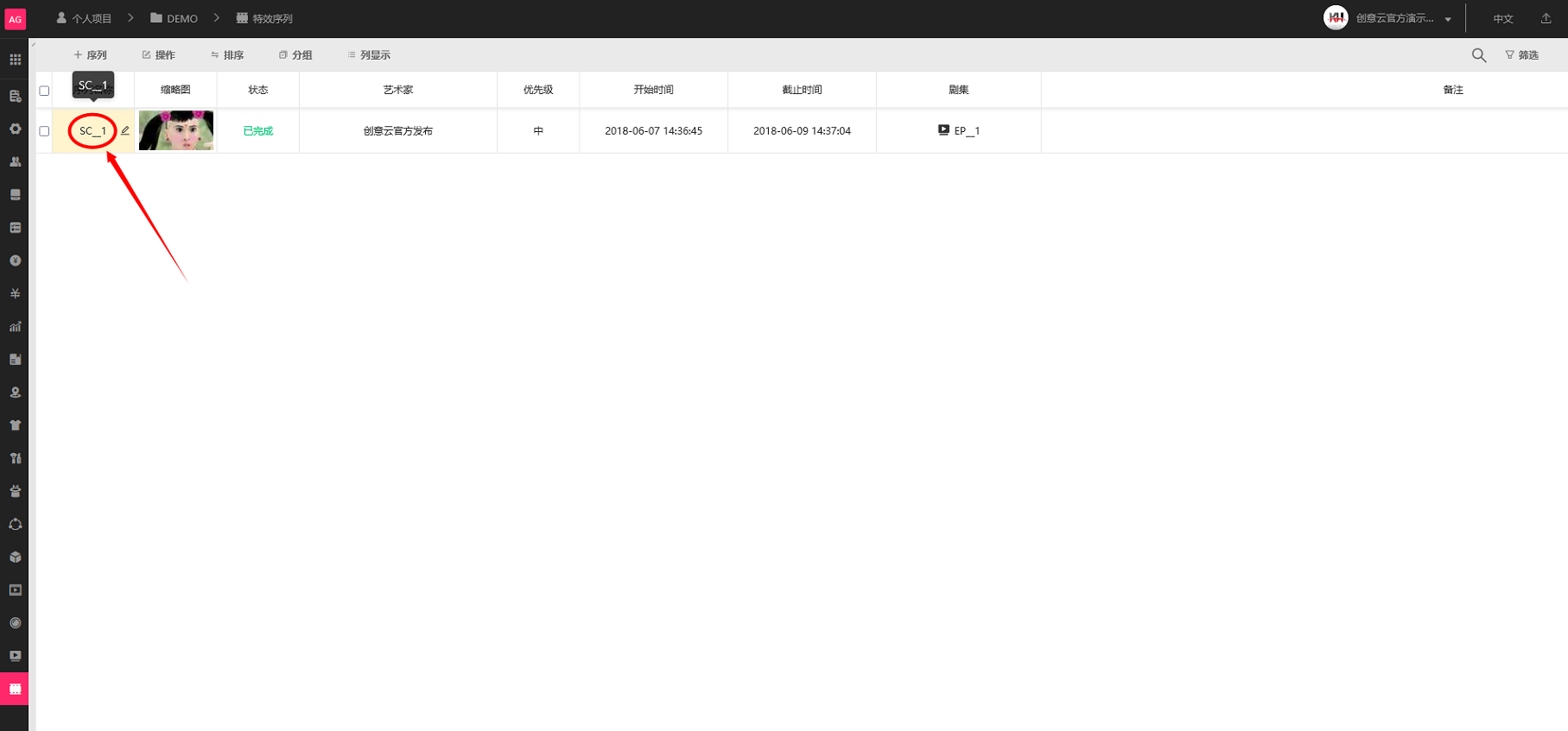 单击单个特效序列任务名称,进入单个特效序列任务的详情页即可查看到该特效序列任务的关联镜头和关联资产。