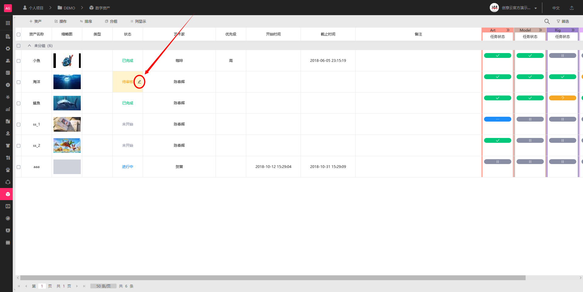 从AGILESHOT导航栏进入项目的“数字资产”模块,AGILESHOT已为资产默认提供Art(设计)、Model(建模)、Rig(绑定)、Texture(贴图)、Animation(动画)共5个状态,点击已创建的单个资产的任务状态上的“笔刷”图标,即可编辑状态。