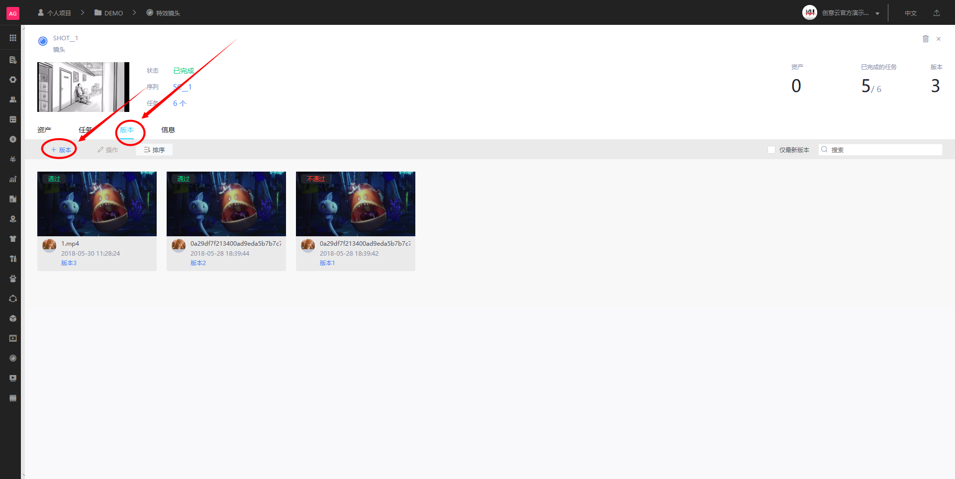 进入镜头任务的全屏详情页后,点击“版本”进入单个资产的版本面板,点击“+版本”即可开始上传制作好需要审核人员审核的镜头文件。注意,镜头文件请勿上传源文件,请根据行业标准上传视频类文件。特殊情况需要上传源文件,请在“路径”面板中填写源文件的工程目录。